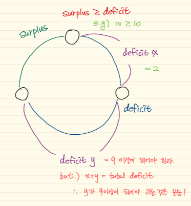 그렇다면 $surpluse >= deficit$ 이면서 나머지 구간에서 실패할 수는 없는것인가? 현재 위치에서 잉여량이 총 $deficit$ 보다 많음에도 나머지 구간에서 실패한다는 것은 나머지 구간의 어느 특정 노드에서 연료가 부족해 다음 단계로 못 나아가는 경우일 것이다.