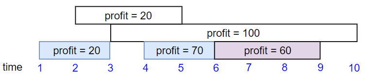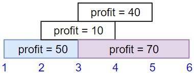 Input: startTime = [1,2,3,3], endTime = [3,4,5,6], profit = [50,10,40,70] Output: 120 Explanation: The subset chosen is the first and fourth job. Time range [1-3]+[3-6] , we get profit of 120 = 50 + 70.